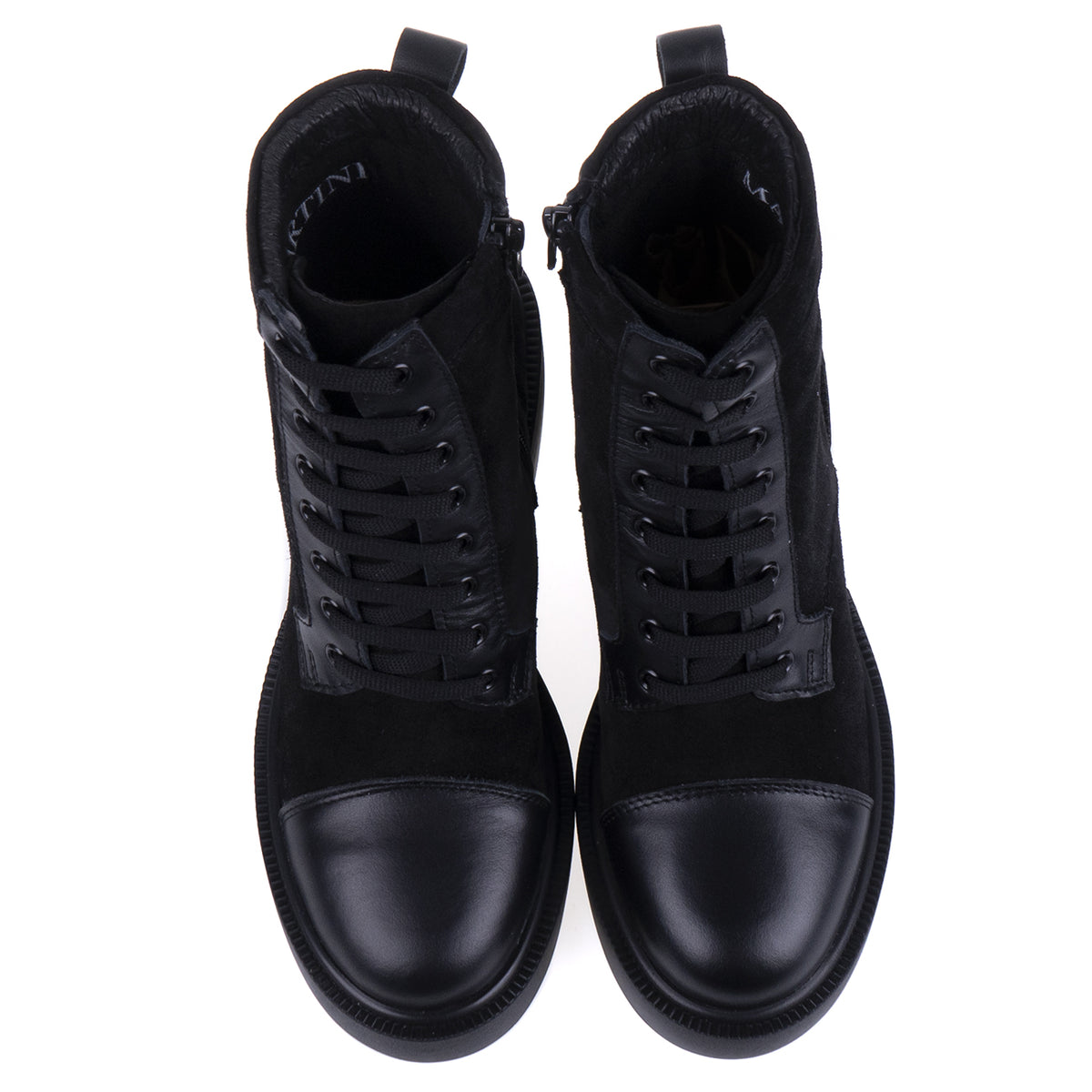Botine pentru femei cu talpă ușoară și stabilă. Sunt fabricate din velur natural moale și piele. Captușeala este caldă, potrivită pentru zile mai răcoroase. Modelul are fermoar pentru a fi mai ușor de încălțat și dezbrăcat, și șireturi pentru strângere și slăbire, după cum este necesar.